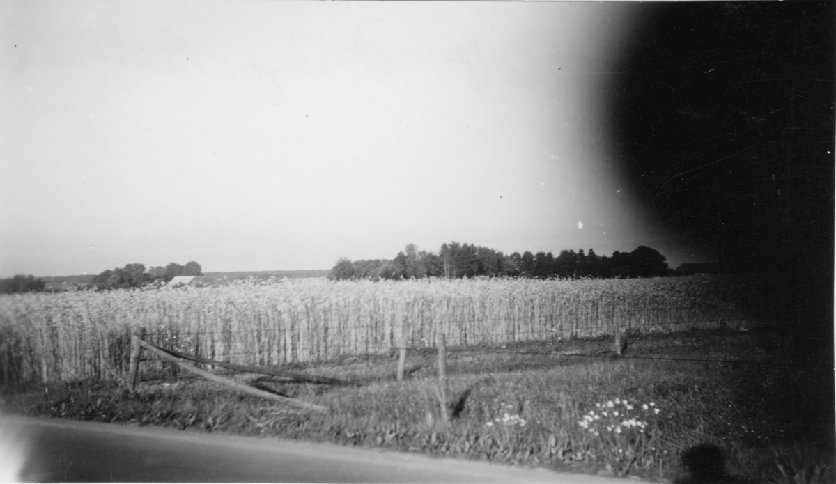 Brålanda. Vetefält I skogsdungen till höger fornlämningar