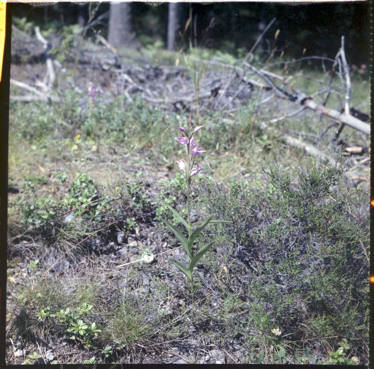 Orkidén Rödsyssla, Cephalanthera rubra. Tisselskog