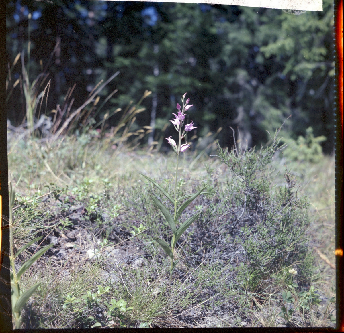 Orkidén Rödsyssla, Cephalanthera rubra. Tisselskog