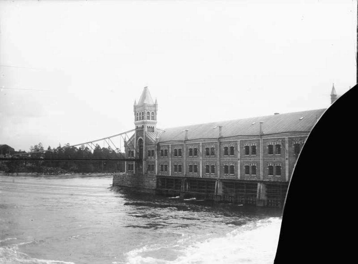 Träsliperiet vid Wargöns AB, byggt 1897. Denna byggnaden, som låg på den västra sidan av älven, brann ner 1918. Slipmassan transporterades med hjälp av ett litet tåg över en hängbro, som med sina hundra meters spännvidd var Sveriges längsta.