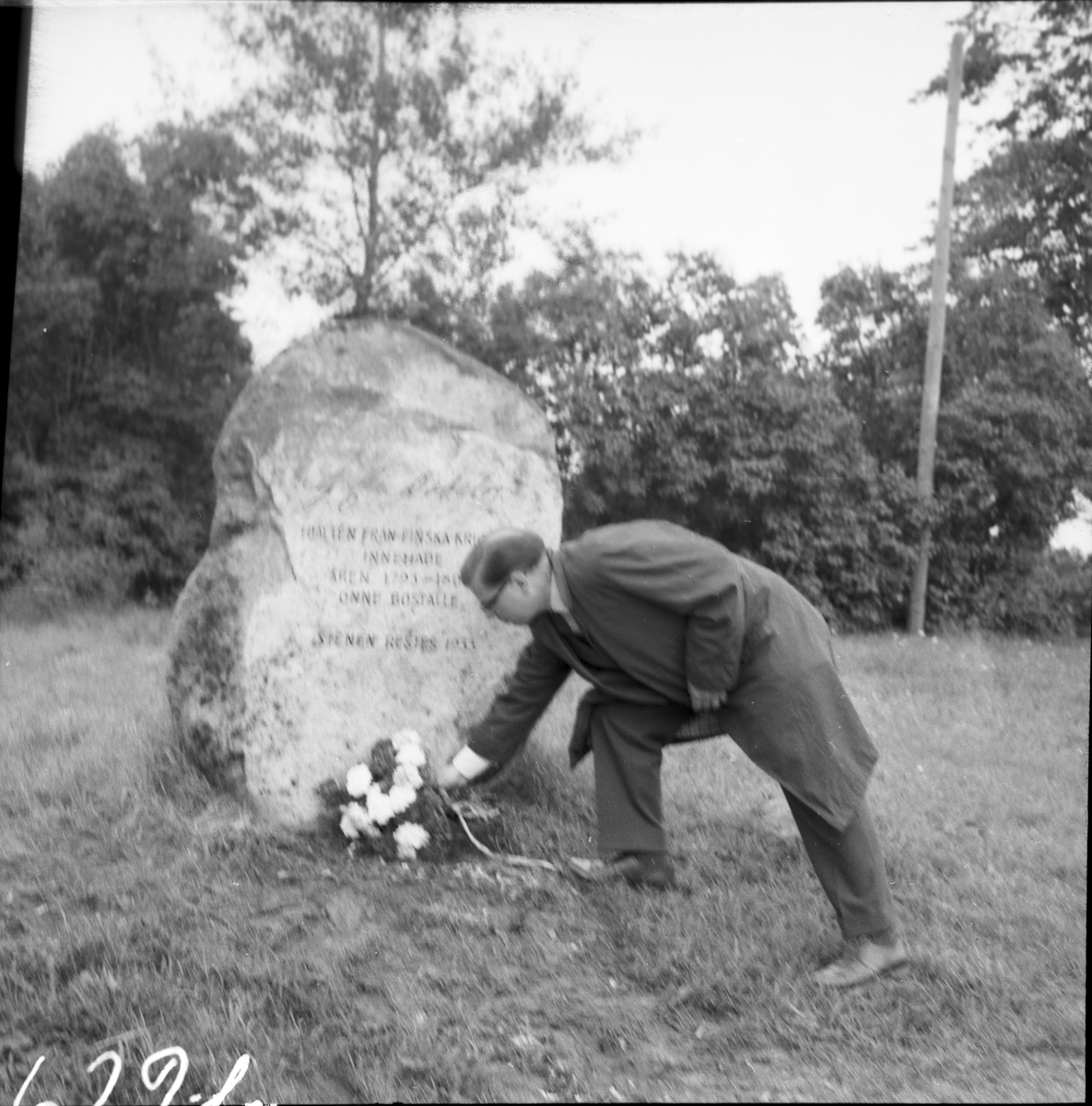 Landsantikvarien nedlägger blommor vid von Döbelns minnessten Önne Järbo