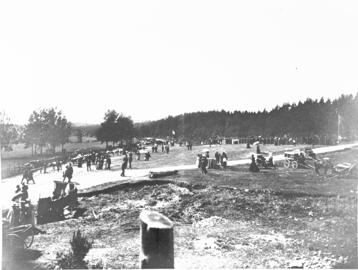 Gamla marknadsplatsen i Ed före 1907. S.k. Hästebacken. Sista marknaden hölls här 1912. Platsen användes också som framgår av detta kort till premiering av hästar och kor. Vid den lilla dungen till vänster uppfördes Muhlbocks Hotell år 1907.