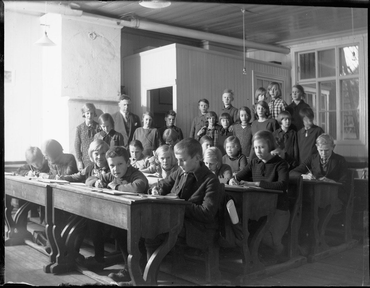 Lilla Edet, Inlands Torpe. Grupp av skolbarn i skolsalen.