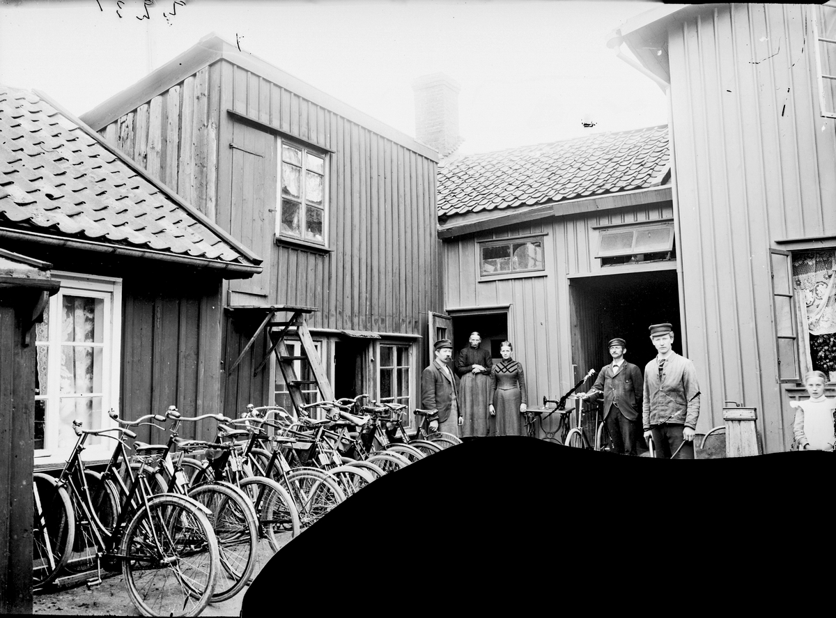 Vänersborg. A J Larssons verkstad. I dörren A J Larsson och Fru Ahlbäck.