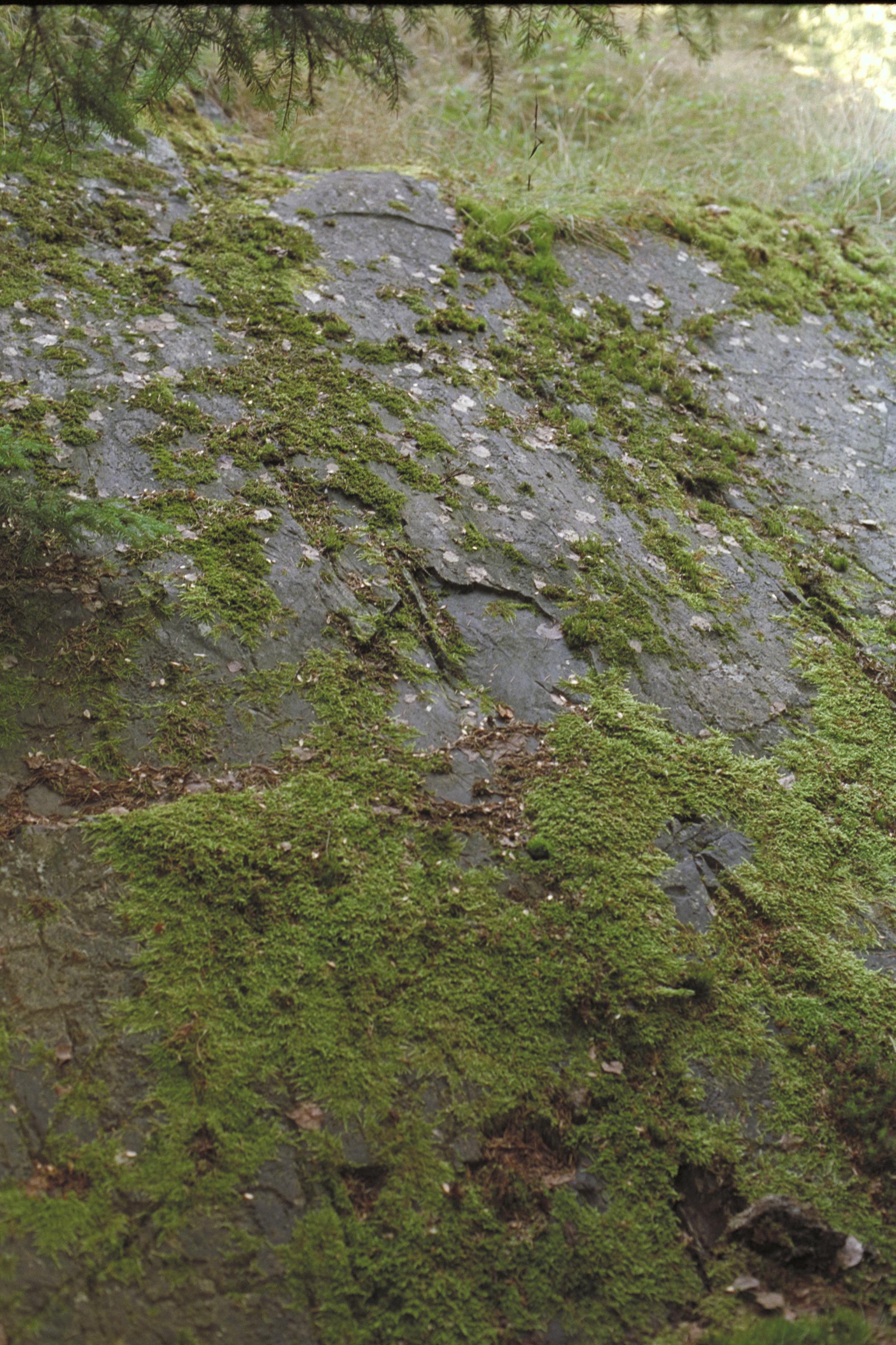 Tisselskog 6:1. Ristning med mossa nerifrån.