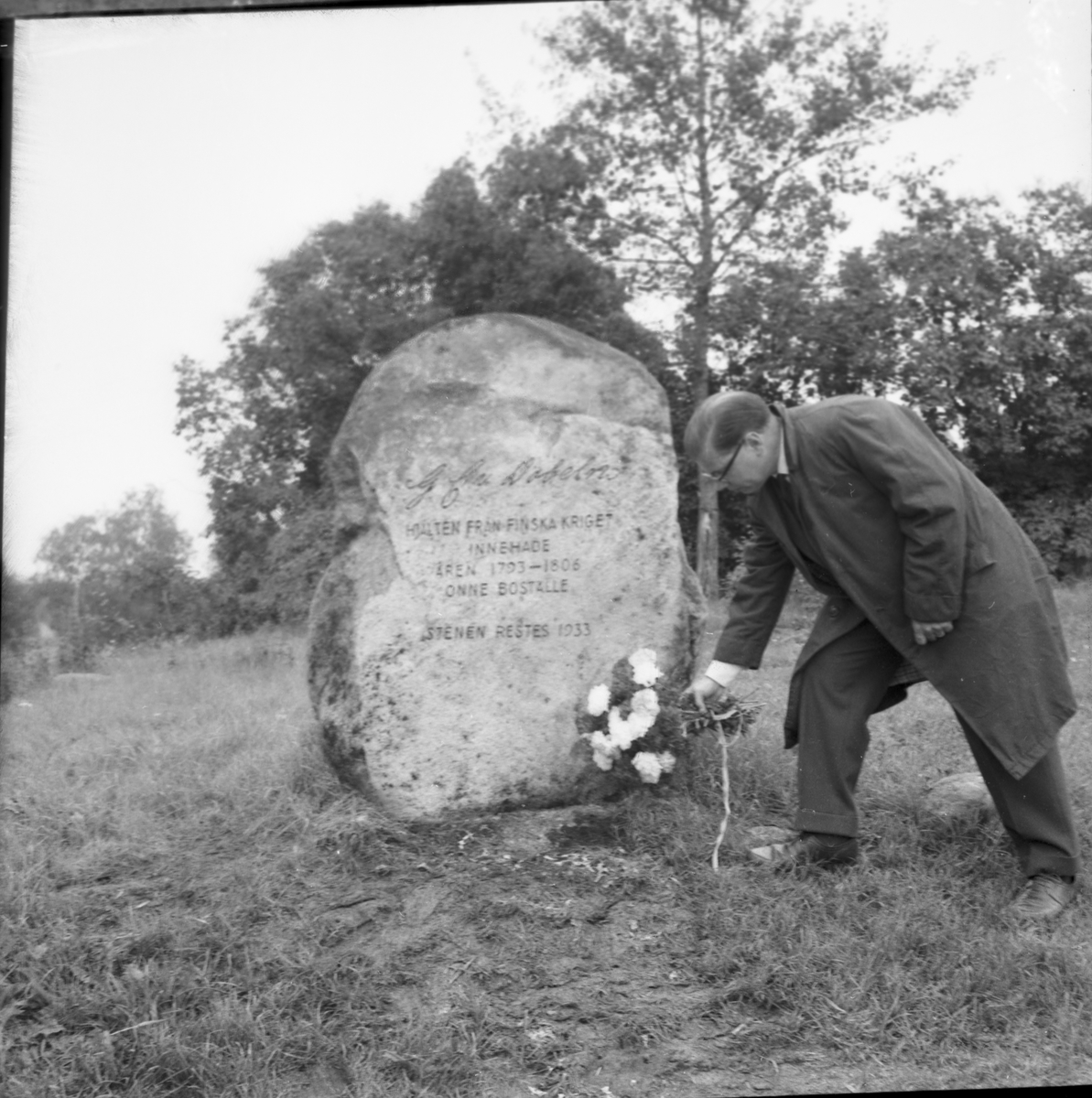 Landsantikvarien nedlägger blommor vid von Döbelns minnessten Önne Järbo