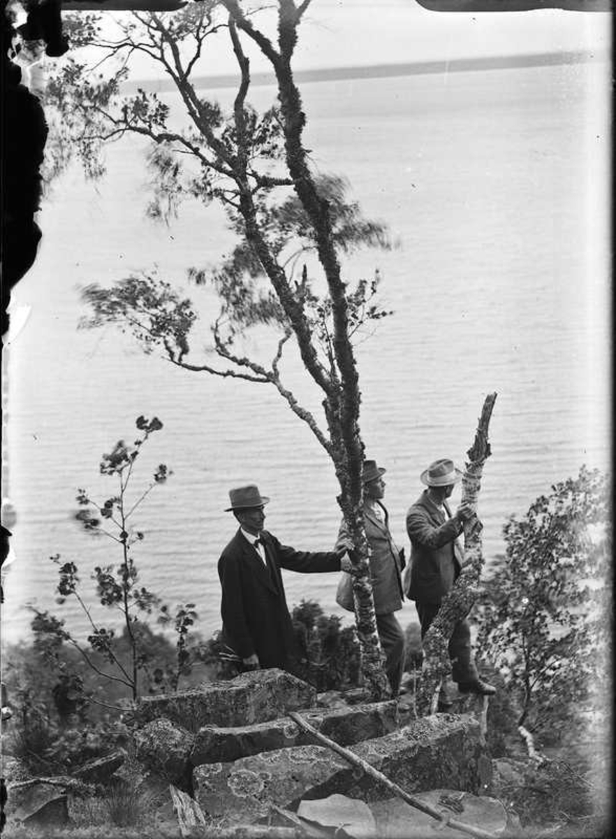 Tre män vid utsikt, troligtvis Halleberg.