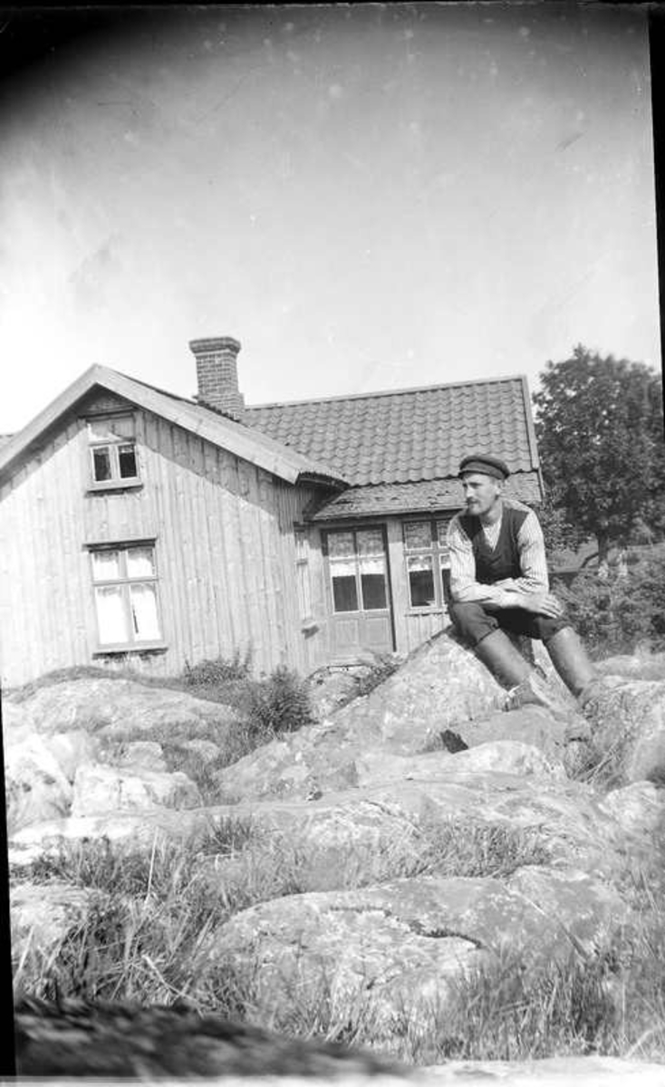 Abraham Jonsson, Hjärtum 1875-01-13, sittande på berget framför boningshuset på Arnstorp.