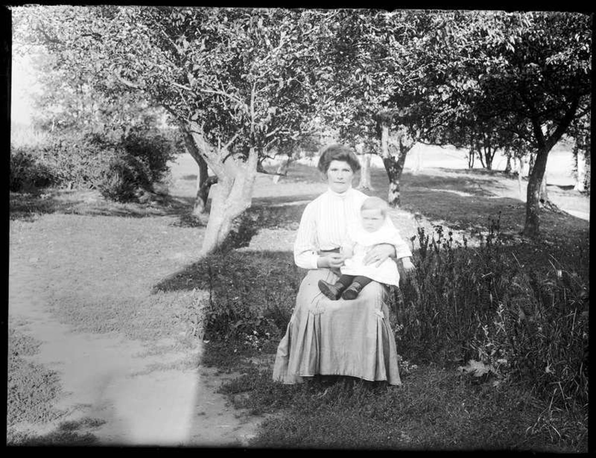 Hilda Jonsson och sonern Valdemar i trädgården på Torpet (Arnstorp)