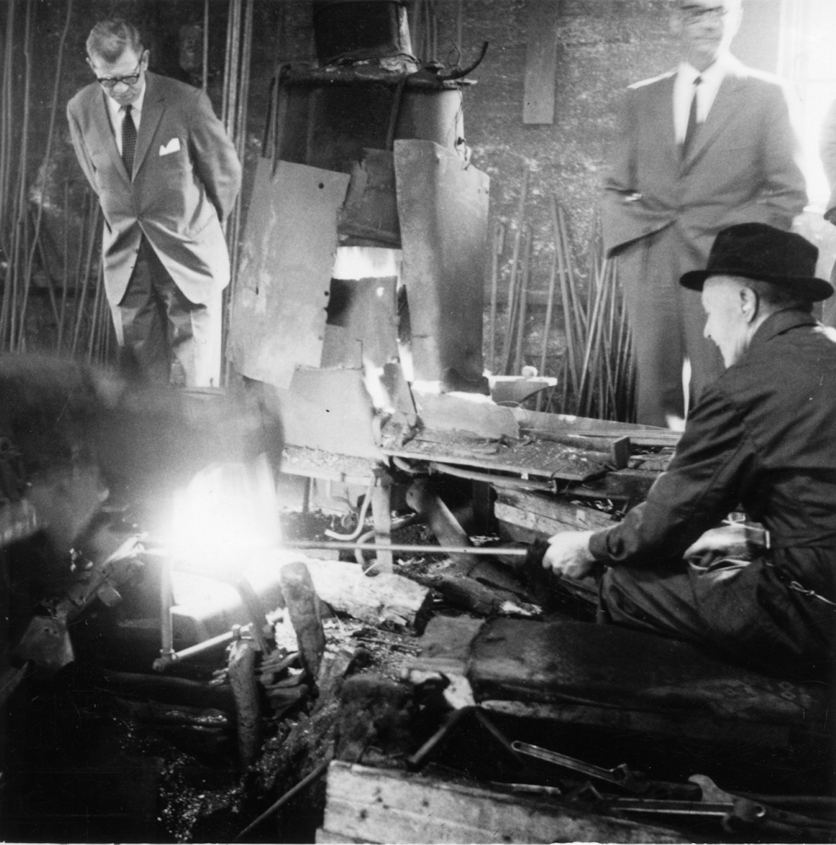 Dalslands Fornminnes- och Hembygdsförbunds årsmöte 1967. Bäcke. Disponent Bjurström smider spik i det gamla bruket.