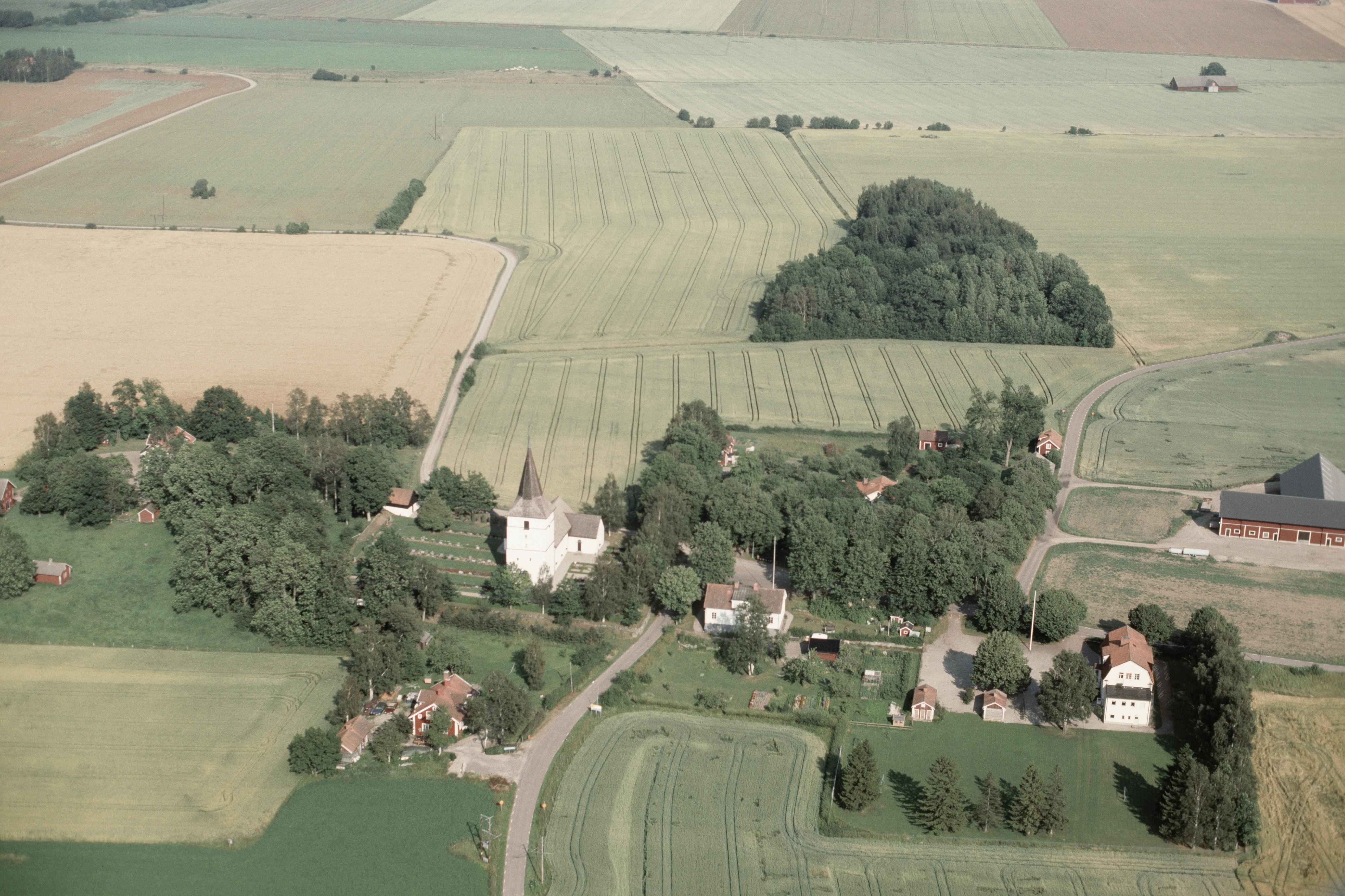 Ekebyborna kyrka och kyrkby. Bilden är tagen mot (väderstreck): ONO