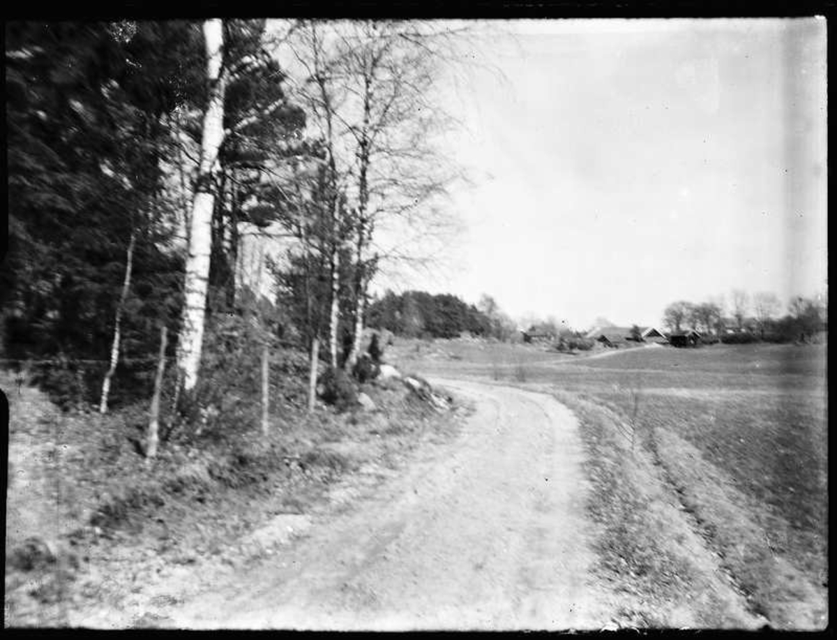 Vy som visar vägen fram till Brevikegårdarna med boningshus och uthus.