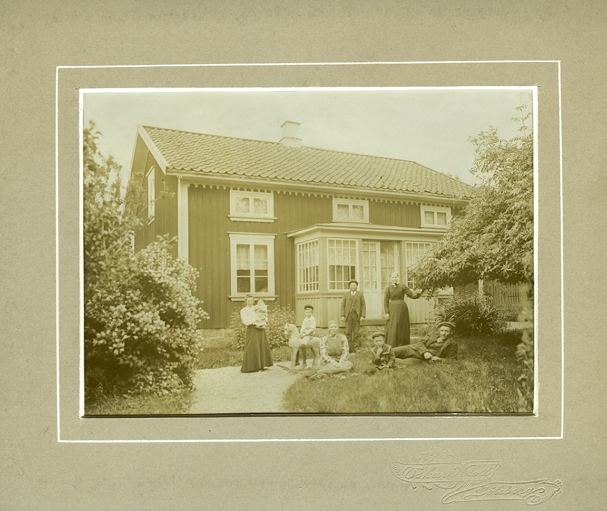 Skyttegården. Lena Flera personer befinner sig på gården utanför huset, både barn och vuxna, kvinnor och män.