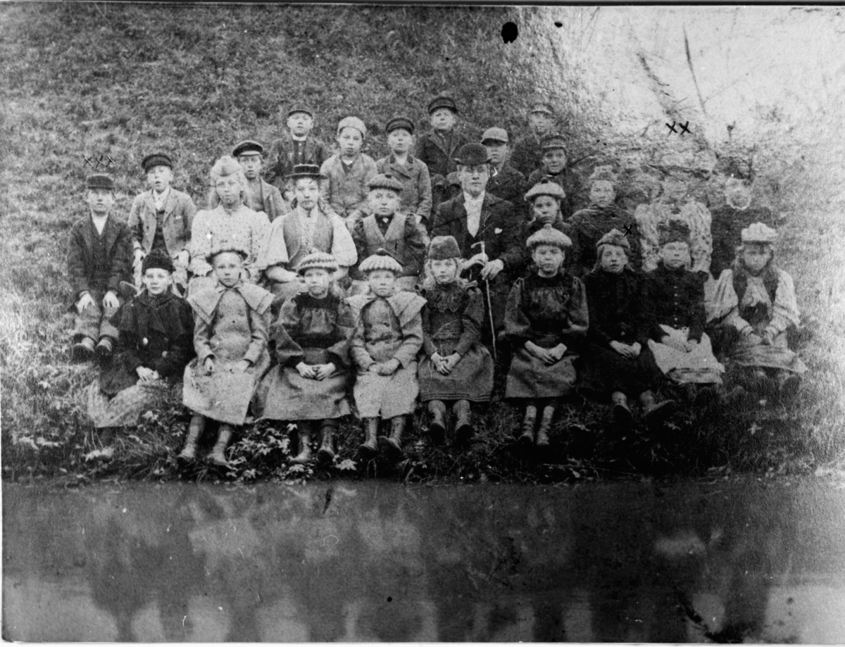 Skolfoto Sunnanå skola och fattiggård. X Emma Olsson Hassle som donerat pensionärshemmet i Mellerud. XX Anna Eriksson Korsgården Järn XXX Paul Carlsson vaktmästare Mellerud.