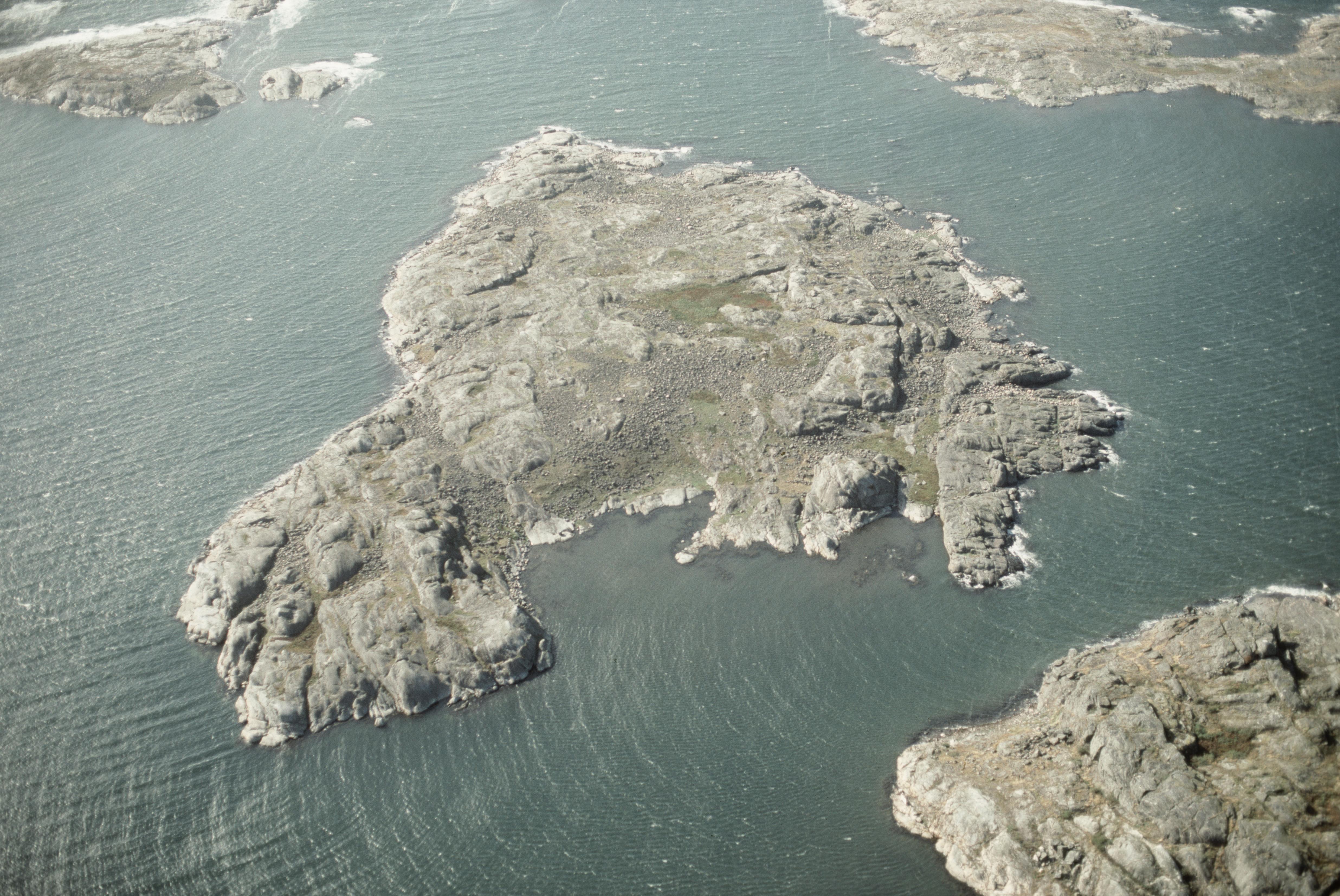 Ön Äxholmen i Källö fjord. Stor koncentration välbevarade tomtningar och fiskeläge RAÄnr Öckerö 116:1, 117:1, 118:1, 119:1. Bilden är tagen mot (väderstreck): V