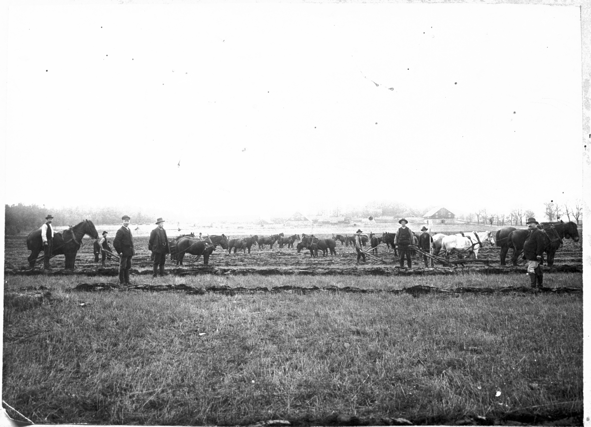 Plöjning mitt för järnvägsstation. Framför är inspektor Adolf Sten, rättaren Lilljeberg, förvaltare Lander. Plöjare som är synliga: August Jonasson, Sörtorp, Evert Andersson, Rödjan, Edvin Johansson Ekedal, (Helmer Johansson Ekedal - syns något bakom hästar) Axel Andersson, Hjelmetorp, John Svensson, Stenstorp, Fredrik Larsson Prestorp och Henning Alfredsson, Sörtorp. Stora Mellby