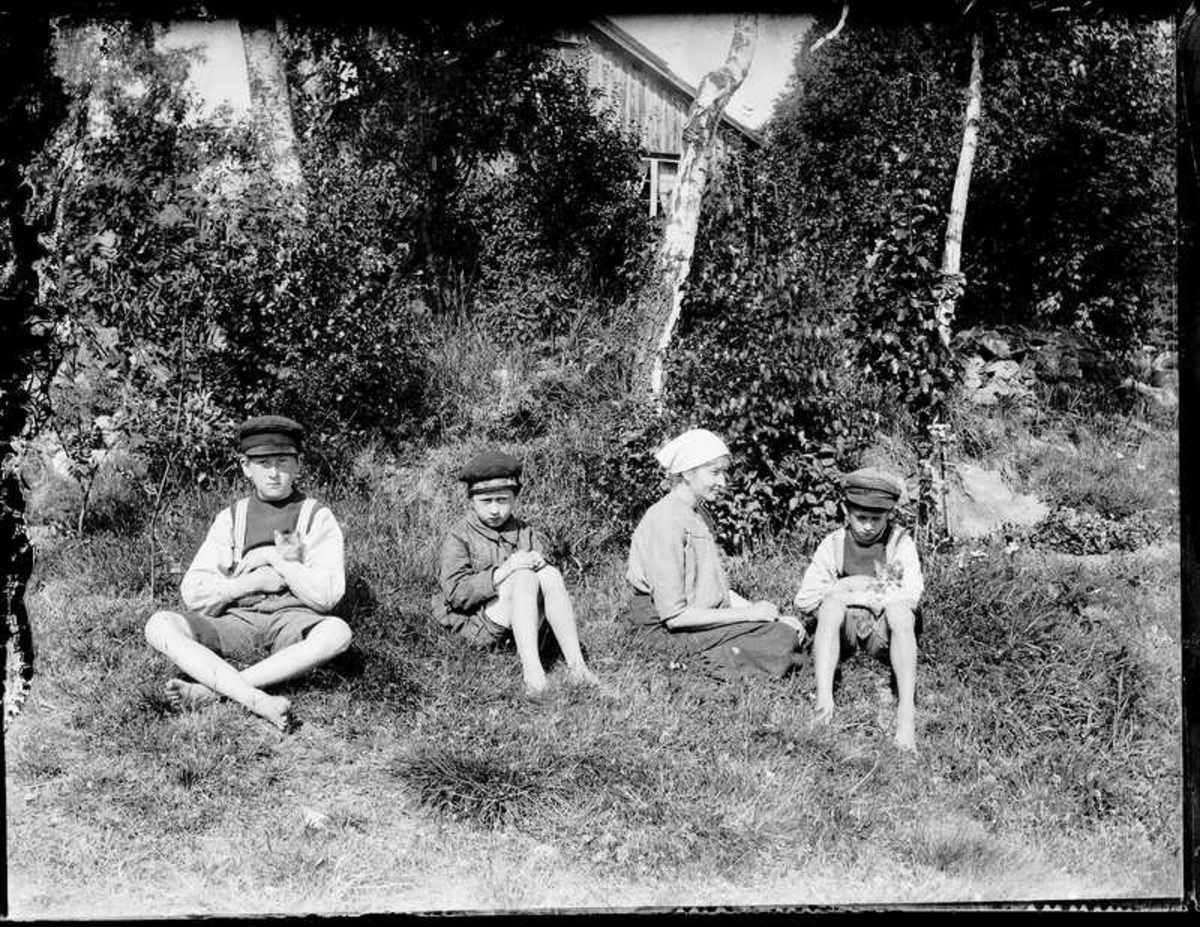 Sven, Hjärtum 1915-05-14, Erik, Hjärtum 1919-07-26, Olga, född Olsson, Forshälla 1891-05-12, Nils, Hjärtum 1918-01-09. Sven och Nils har kattungar i knät.