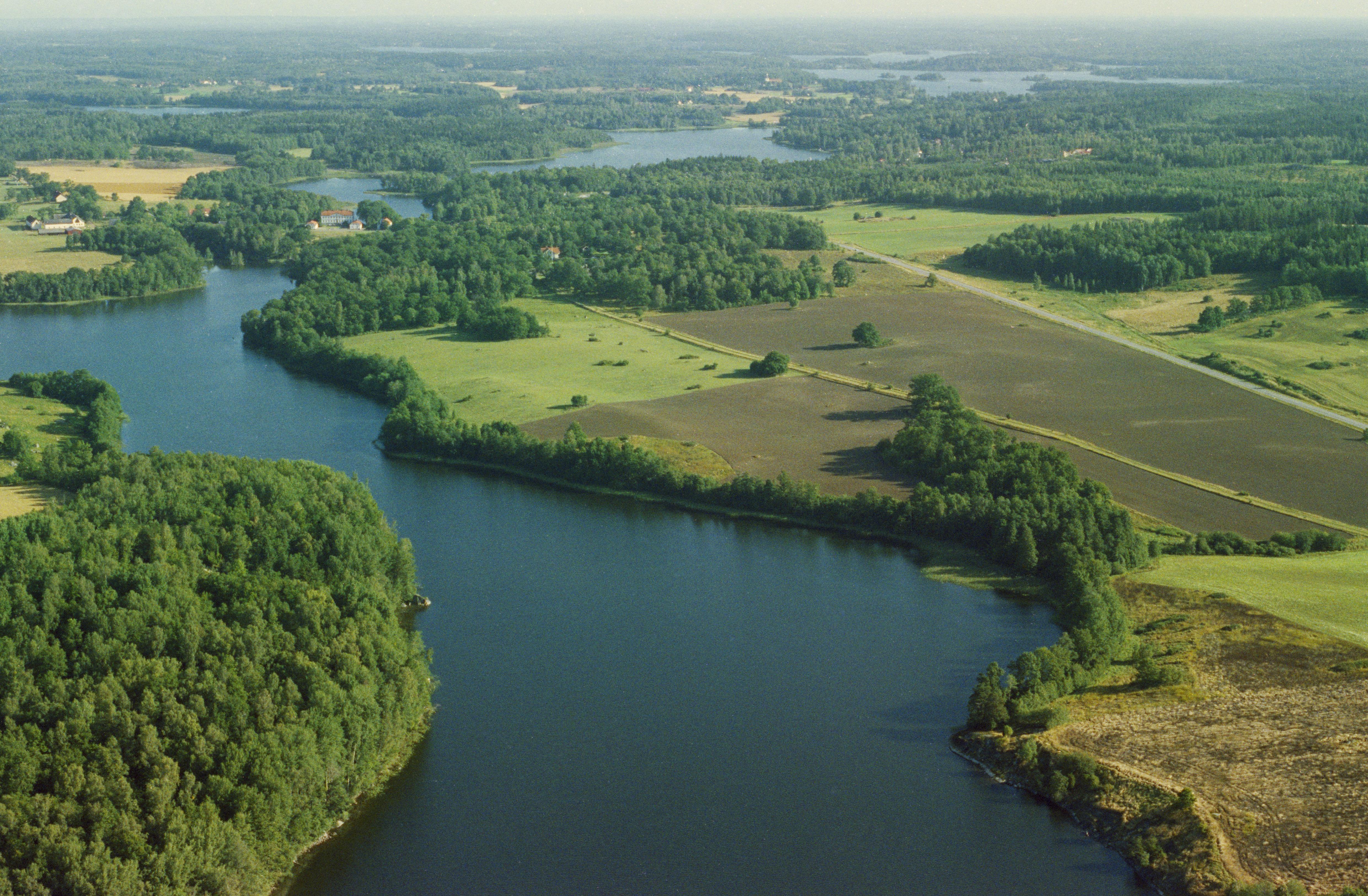 Ekesund. Brokinds slott i bildens övre del till vänster vid naturreservatet Brokinds lövskog. Bilden är tagen mot (väderstreck): NNO
