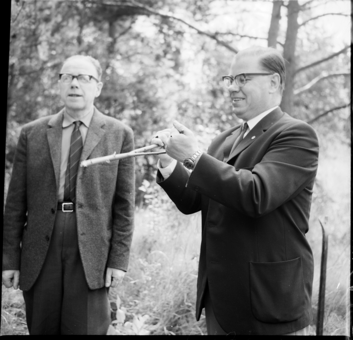 Trollhättan, Slätteberget. Museets personal ute på uppdrag att söka efter hällristningar. Landsantikvarie Hallbäck håller i en slagruta.
