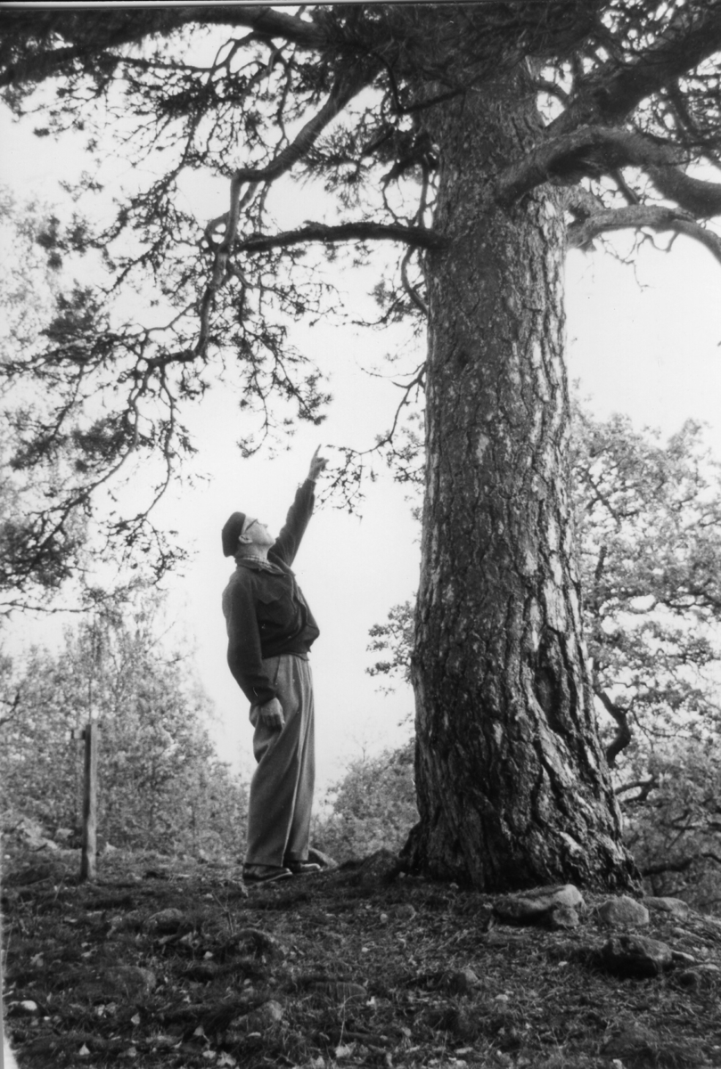 Moserur i Tvärredslund. Bertil Nordström pekar på de järnbeslag som finns kvar efter förläggargårdens lusthus, som förr fanns i trädet. Trädet står i Tvärreds största bronsåldersröse, Raä nr 3.