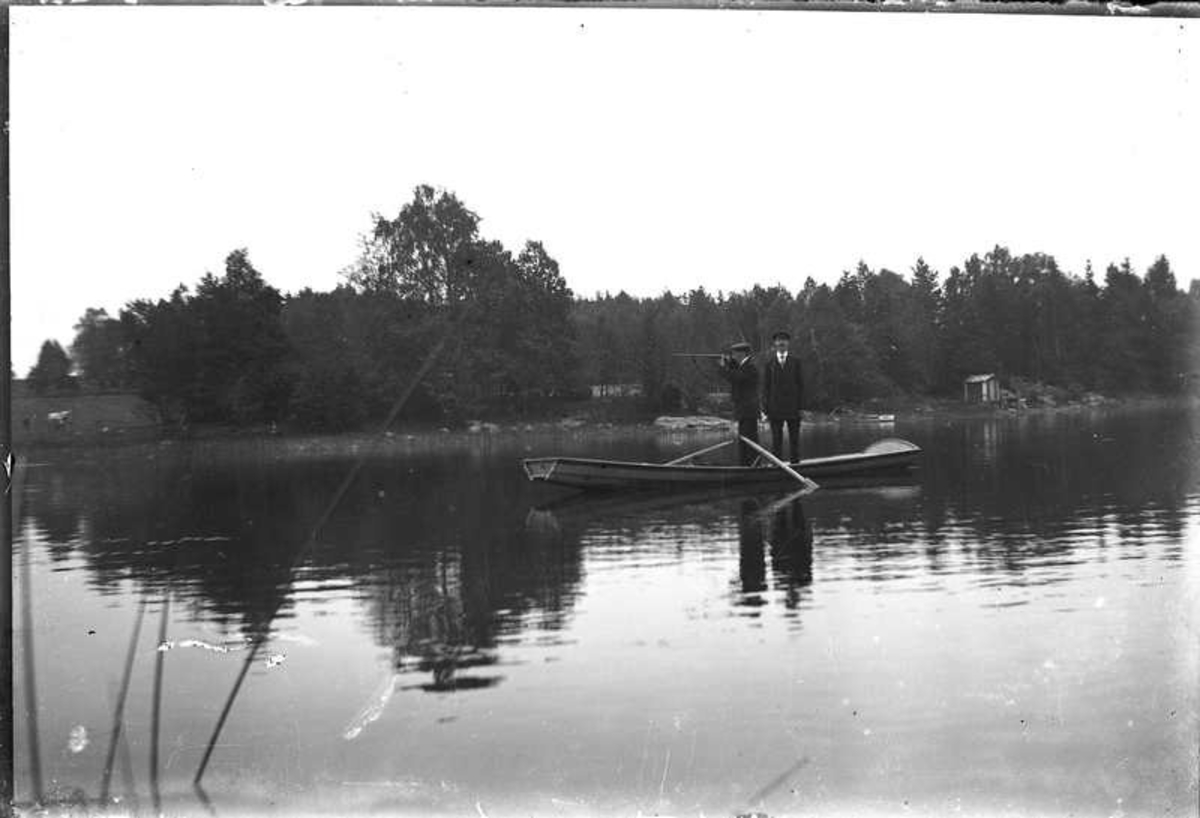 Två personer i en eka, den ene med gevär. Troligtvis i trakten kring Vänersborg.