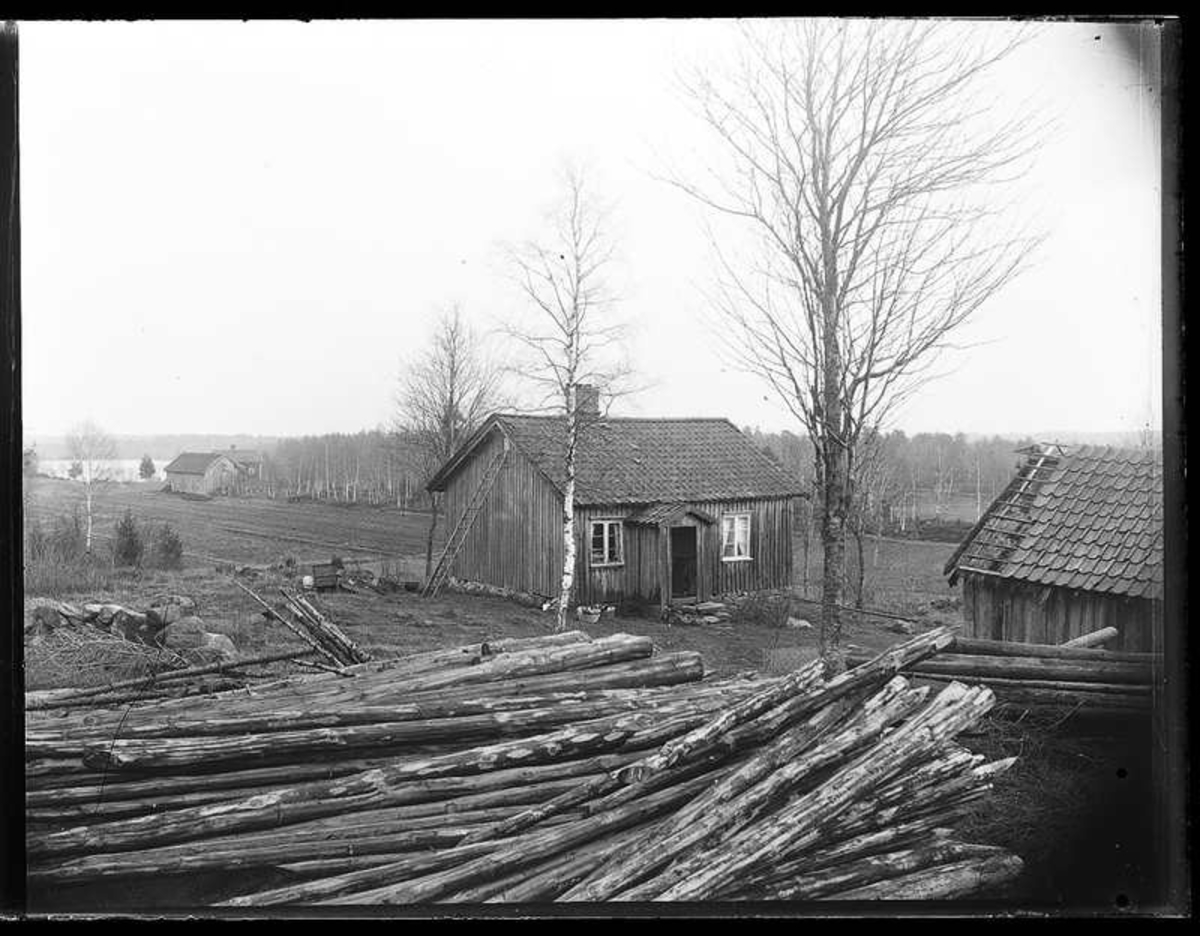 Olof Jonssons bostadshus och ladugård i framkanten av bilden syns en mängd barkade timmerstockar av varierande storlek. I bakgrunden syns ladugården hos grannen med två gödselstackar.