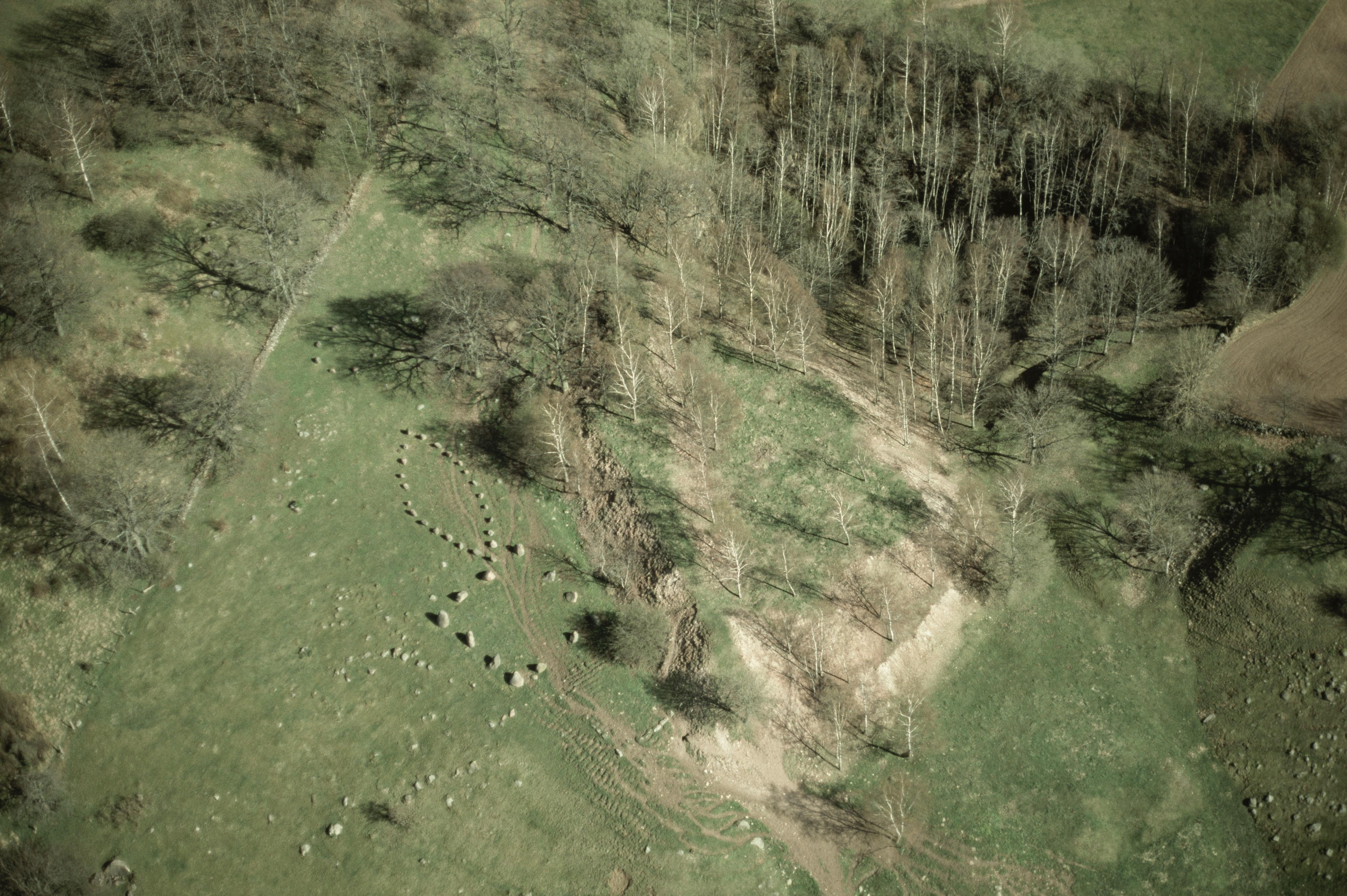 (Skrivs även Amundstorp). Gravfält Biskopskullen. Högarna skeppssättning och domarring m.m. RAÄnr Norra Lundby 62:1. Bilden är tagen mot (väderstreck): Ö
