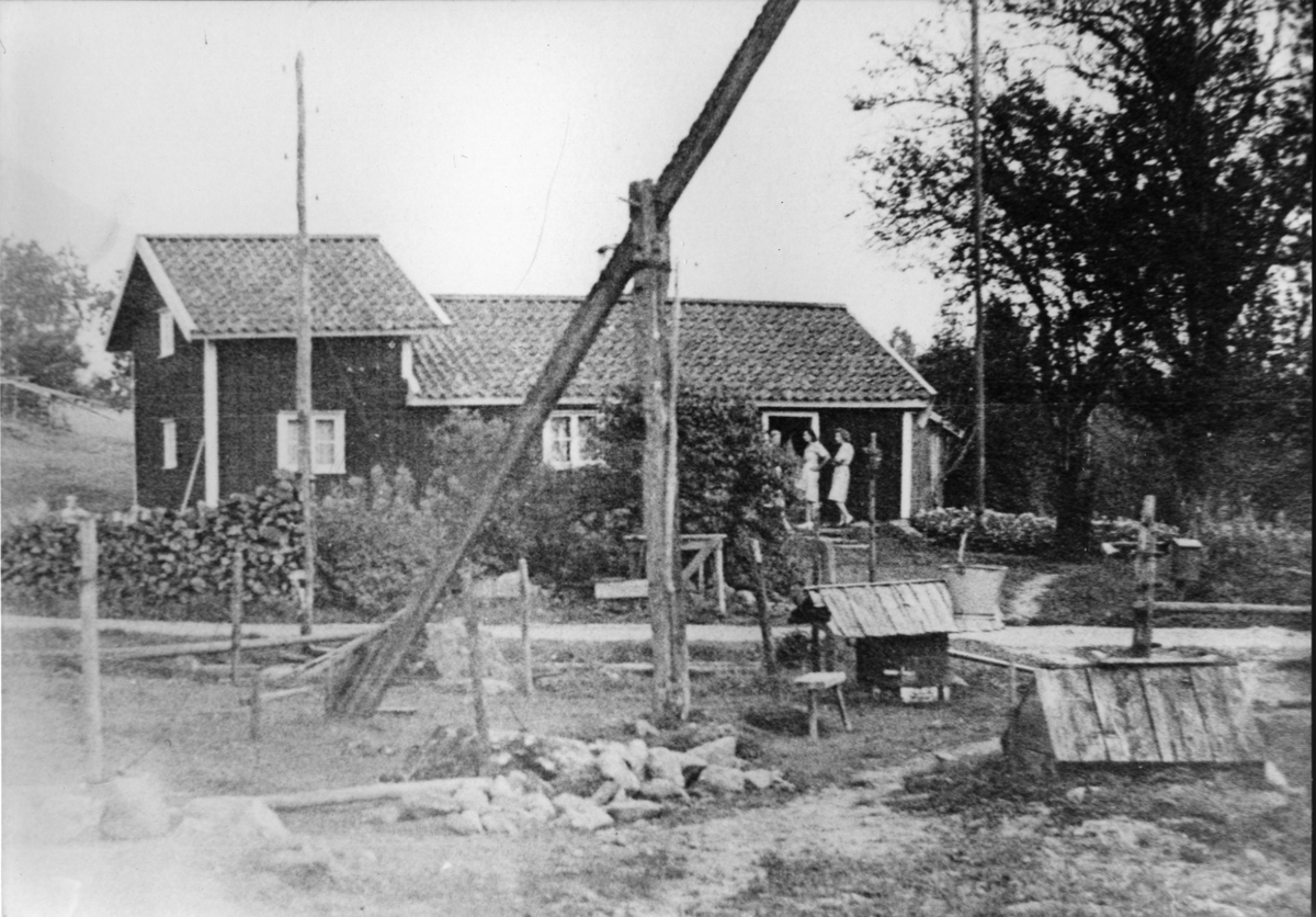 Mia och Hugo Leanders stuga i Alhammar. Mia bodde här till 1985. Tvärreds sista fast bebodda ryggåsstuga (här med loftbod). Lägg märke till brunnsholken, brunnsvokten och den täckta brygghusgrytan. Se Tvärred förr och nu sid 344.