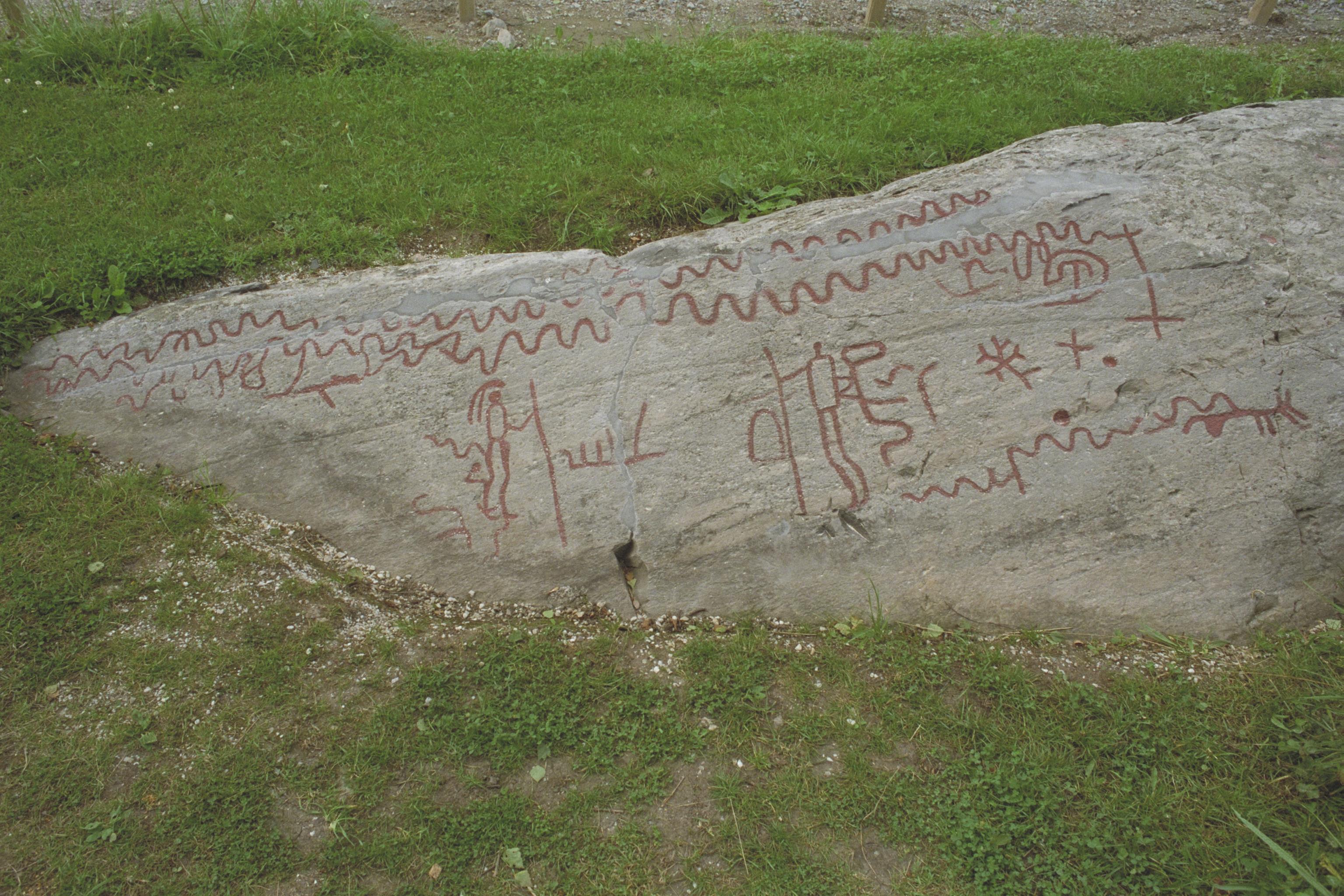 RAÄ-nummer Tisselskog 10:1. Krigarhällen. Människofigurer med spjut och ormliknande figurer.