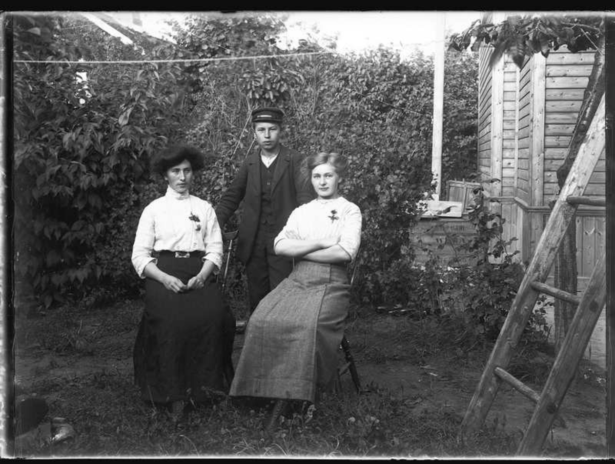 Fastigheten med två hus tillhörande f d poliskonstapel Johan Alfred Skogsbergs, Västra Tunhem 1858 och hans hushåll. I ett av husen fanns också ett Nykterhetskafe och damerna på bilden och den unge mannen tillhörde troligen personalen här.