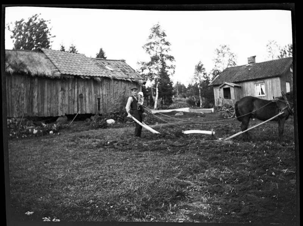 Olof Jonsson, Hjärtum 1882-11-15 och sonen Sven, Hjärtum 1915-05-14, plöjer med hästen framför den gamla ladugården, som delvis har halmtak.