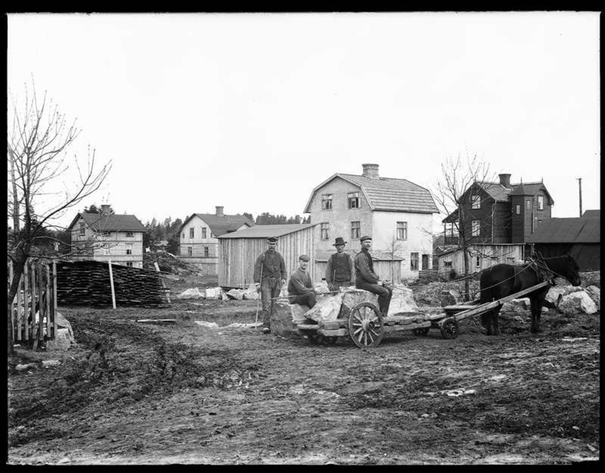 Olof Jonssons text: Grundläggning av Johans hus. På bilden okänd, Johan Jonsson, Hjärtum 1880-11-01, okänd, okänd. Bilden är tagen när boningshuset på Saga 3 skall byggas och är tagen snett uppifrån på Hjärtumsgatan 9.