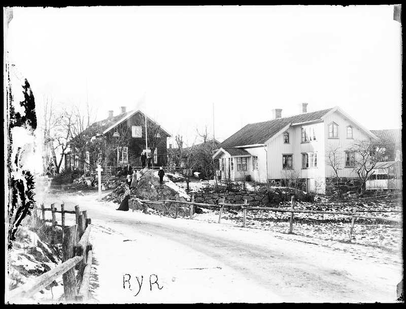 Vy med den gamla vägen och Rybergs affär i förgrunden och församlingshemmet längre upp i backen.