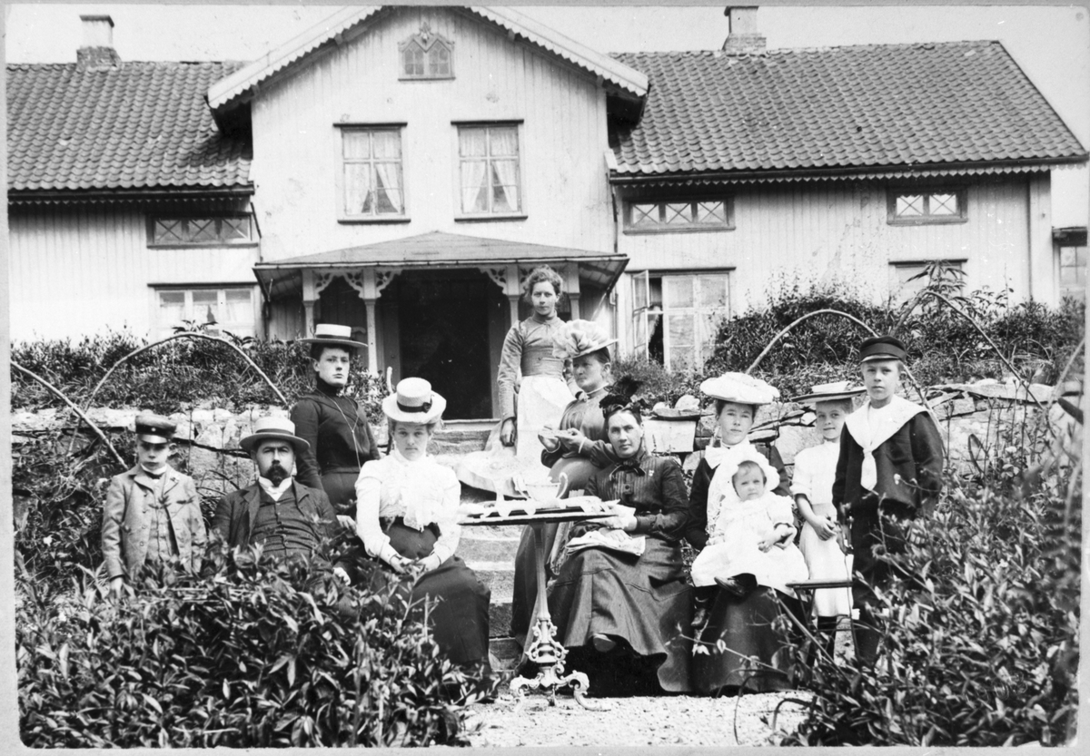 Stigen sommaren 1901. Fru Maria Andersson mellan sonhustrurna Marie-Louise med dottern i knäet, barnen Anna och Erik vid sidan, Hildur med maken Valdemar. Bakom Maria står fröken Hilda Lundgren faster till Hildur Andersson och flickskolelärarinna i Vänersborg. Ovanför Hilda Lundgren står junfgfrun Tilda från Svenstakan.
