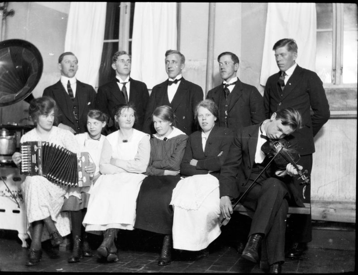 Personal på gamla ålderdomshemmet. Torpagården Vänersborg Stående från vänster. 1. Fritiof Andersson 2. - 3. Viktor Eriksson 4. - 5. John Andersson Sittande från vänster 1. - 2. Elin Tidstrand 3. Helge 4. Cecilia Eriksson 5. Ingeborg Pettersson 6. Egon Eriksson.
