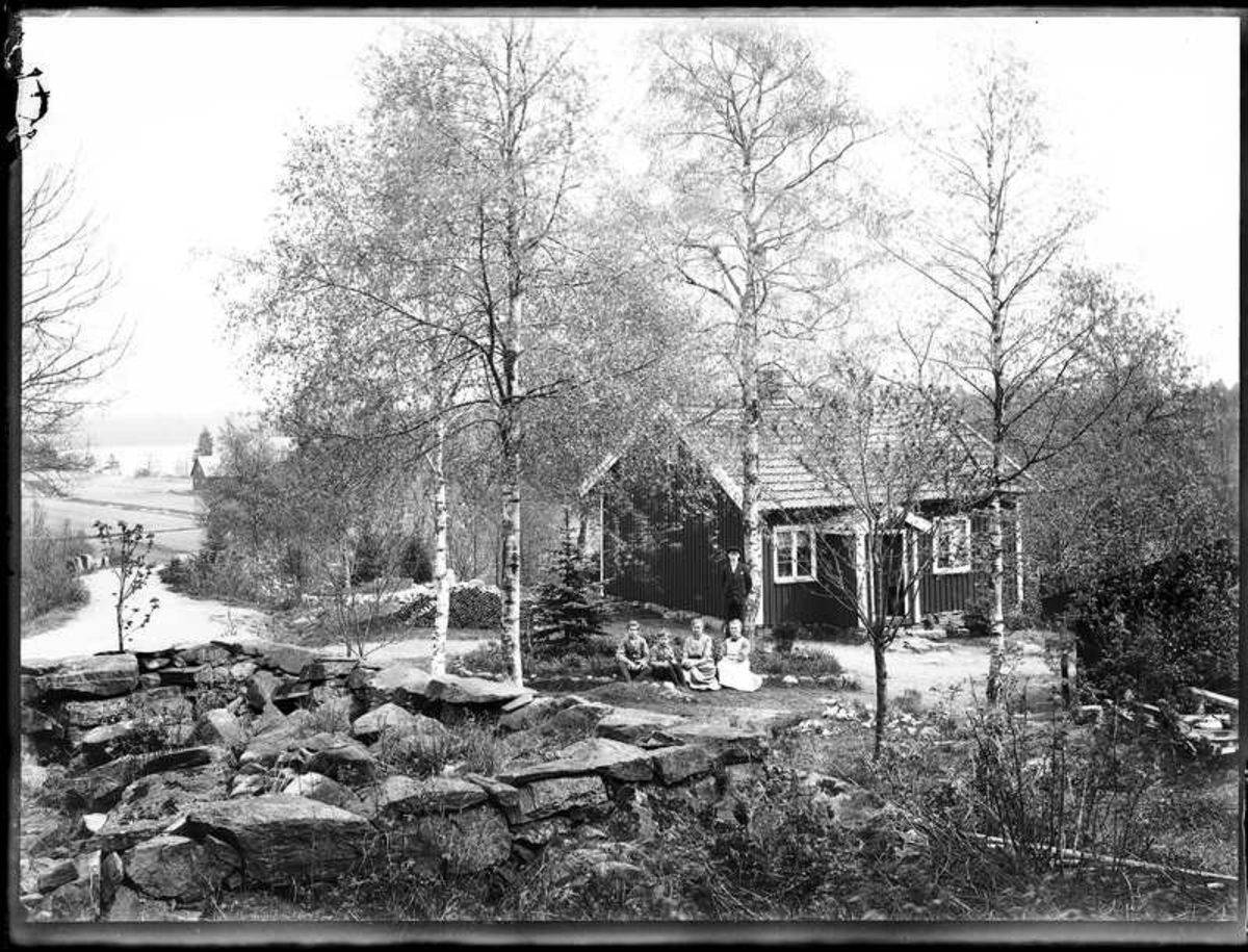 Familjen Jonssons rödmålade bostadshus med vita knutar och tvåkupiga tegelpannor på taket. Sven, Hjärtum 1915-05-14, Nils, Hjärtum 1918-01-09, Erik, Hjärtum 1919-07-26, Olga, född Olsson, Forshälla 1891-05-12 och Olofs syster Jeanna Jonsson, Hjärtum 1874-04-03. I bakgrunden syns Öresjö och vägen mellan Sågbron och Nötbron, Fjällvägen med sina stengardister. Vid sidan av huset ligger tegelrör till dränering.