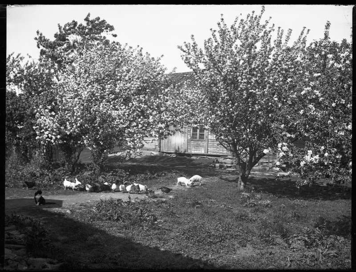 Aplarna blommar i trädgården på Arnstorp. På bilden syns också två små grisar, ett tjugotal hönor och en svartvit katt. I bakgrundet det gamla boningshuset på Torpet (Arnstorp).
