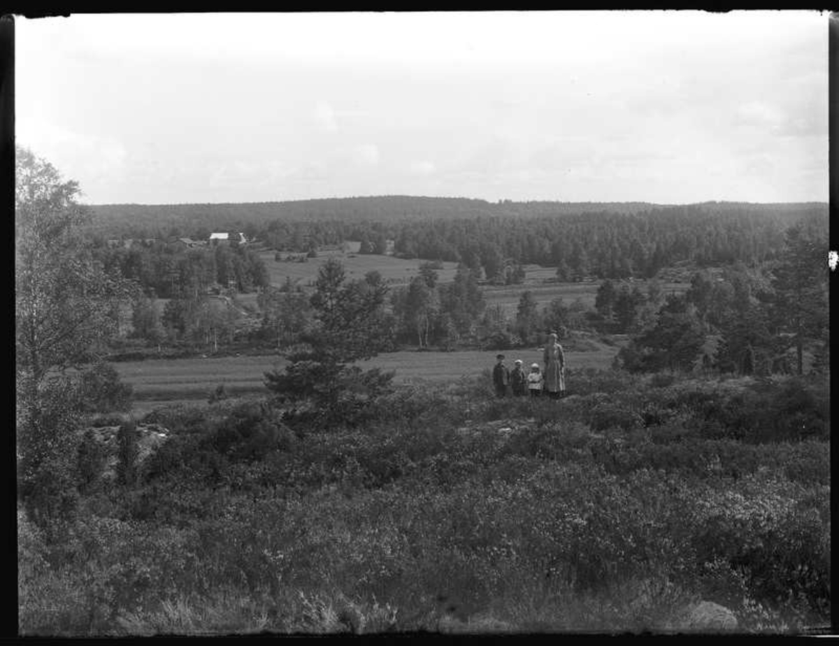 Vy med den gamla och nya ladugården på Arnstorp i bakgrunden. I förgrunden står Sven, Hjärtum 1915-05-14, Nils,Hjärtum 1918-01-09, Erik, Hjärtum 1919-07-26, Olga, född Olsson, Forshälla 1891-05-12.