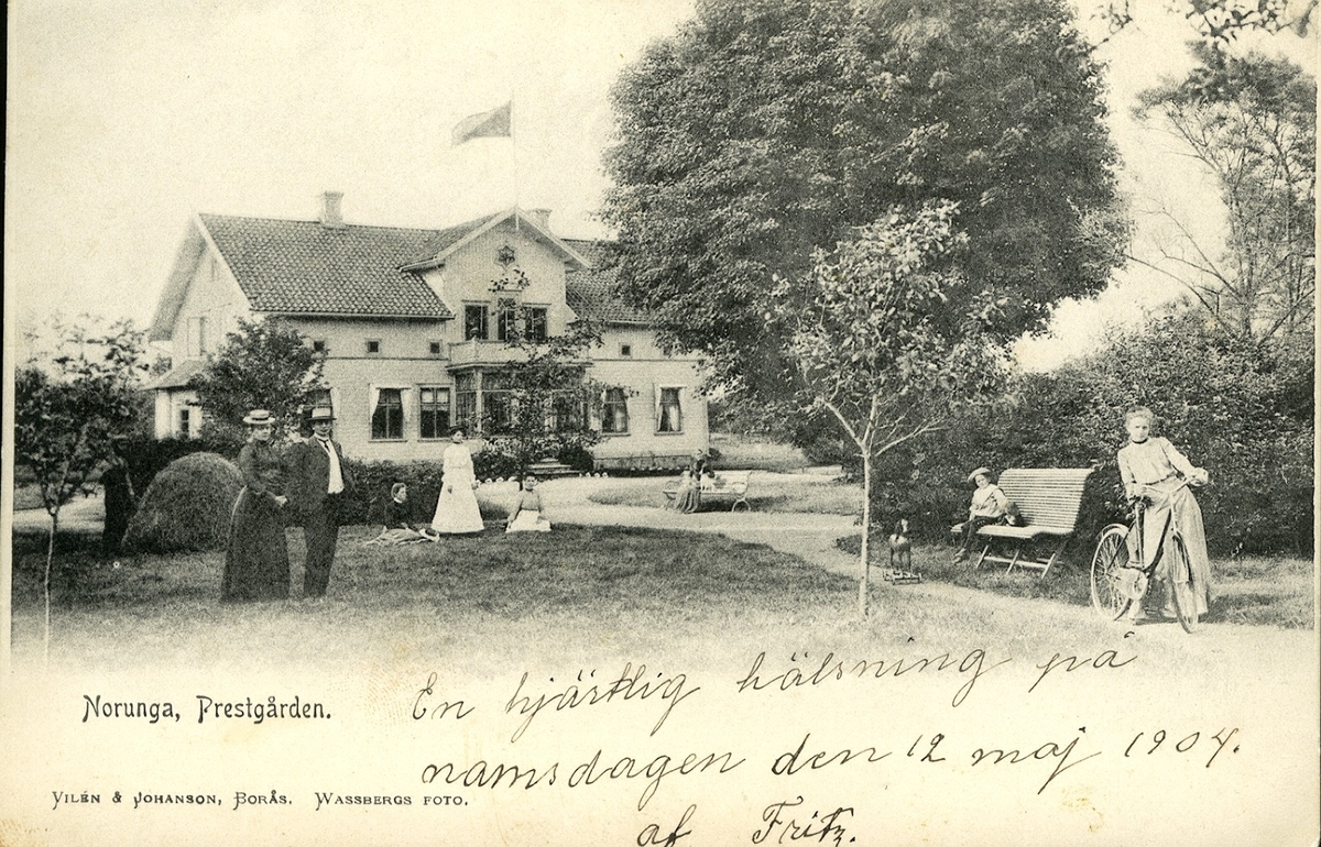 Flera personer, vuxna och barn, placerade vid prästgården. Nårunga Handskriven text på kortets framsida: En hjärtlig hälsning på namnsdagen den 12 maj 1904 af Fritz. Fotot gåva från Åke Karlsson, Siene.