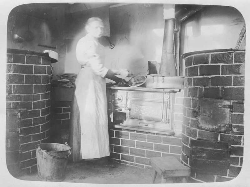 Köket i fängelset. I de båda stora grytorna kokades bl a gröt och gula ärtor. Obs den stora vispen i grytan till höger. Vid spisen kokerskan Anna Andersson, Fängelset Vänersborg
