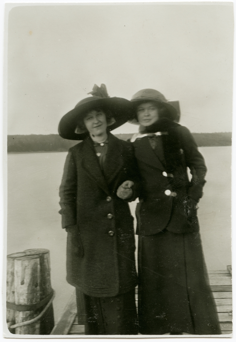 Vänersborg. Porträtt på två två kvinnor, Dalbobergen i bakgrunden.