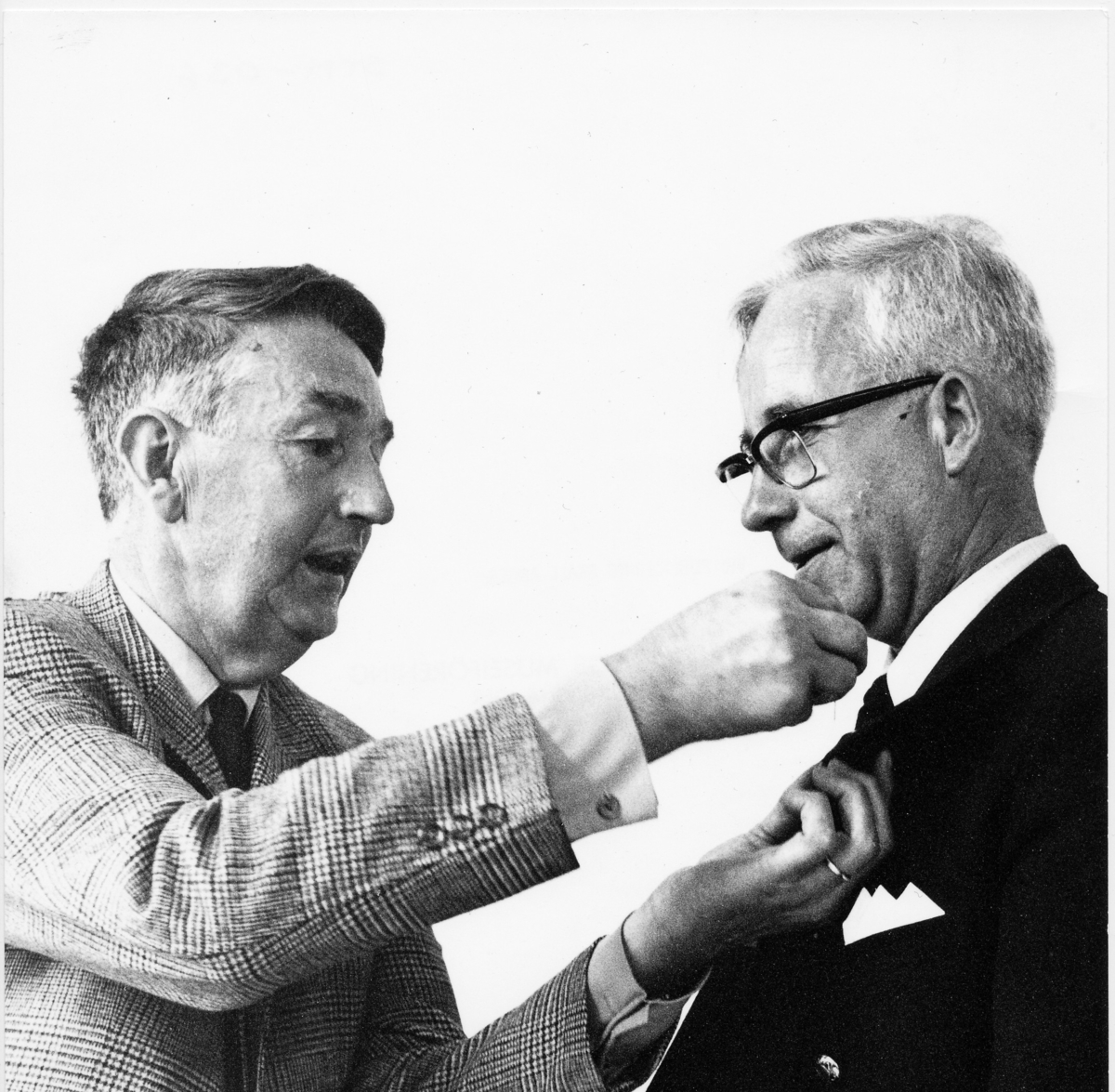Stora Mellby. Åke Imark får här Samfundet för hembygdsvårds guldnål för initiativ att restaurera väderkvarnarna i St Mellby sn. Guldnål överlämnad av Västergötlands Hembygdsförbunds ordf. H. Persson-Lilja efter invigningen av Borgs väderkvar 1972.