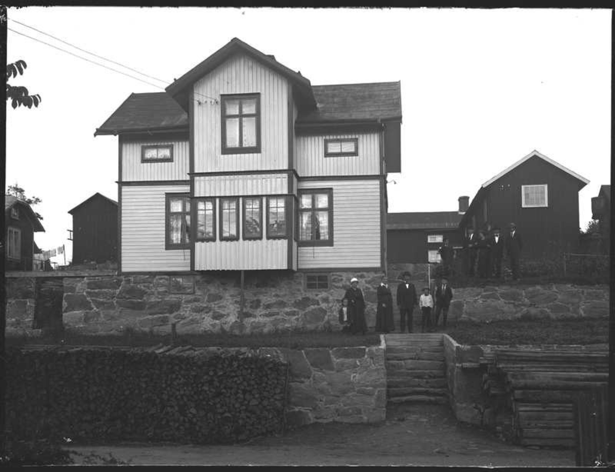Olof Jonssons text: Samuelssons i Strömslund. Enligt församlingsboken 1920 så bodde här 18 personer 1920. Bland andra Slaktare Johan Alfred Samuelsson, Vassenda-Naglum 1859, hans hustru Amalia Kristina Samuelsson, Vassenda-Naglum 1862, deras barn: Diversearbetare Gustav Evald, Hjärtum 1893, Elektriker Ernst Algot, Vassenda-Naglum 1899, Yngve Ivar Samuel, Vassenda-Naglum 1903, och oä Karl Olof Fredrik, 1912. Gissningsvis så har vi slaktare Johan Alfred Samuelsson och hans fru stående till höger på bilden. Övriga troligen deras barn med familjer.