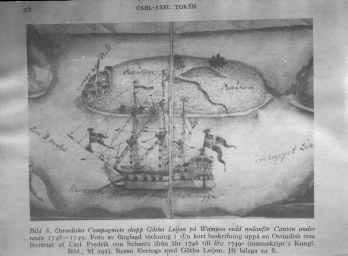 Gunnarsnäs, Fatyget Götha Leijon där Bengt Nordahl från Låttsbyn var skeppspräst. Foto av färglagd teckning i En kort beskrifning uppå en Ostindiska resa förättad af Carl Fredrik von Schantz åhr 1746 till åhr 1749. (manuskript i Kungl. Bibl., M 292).