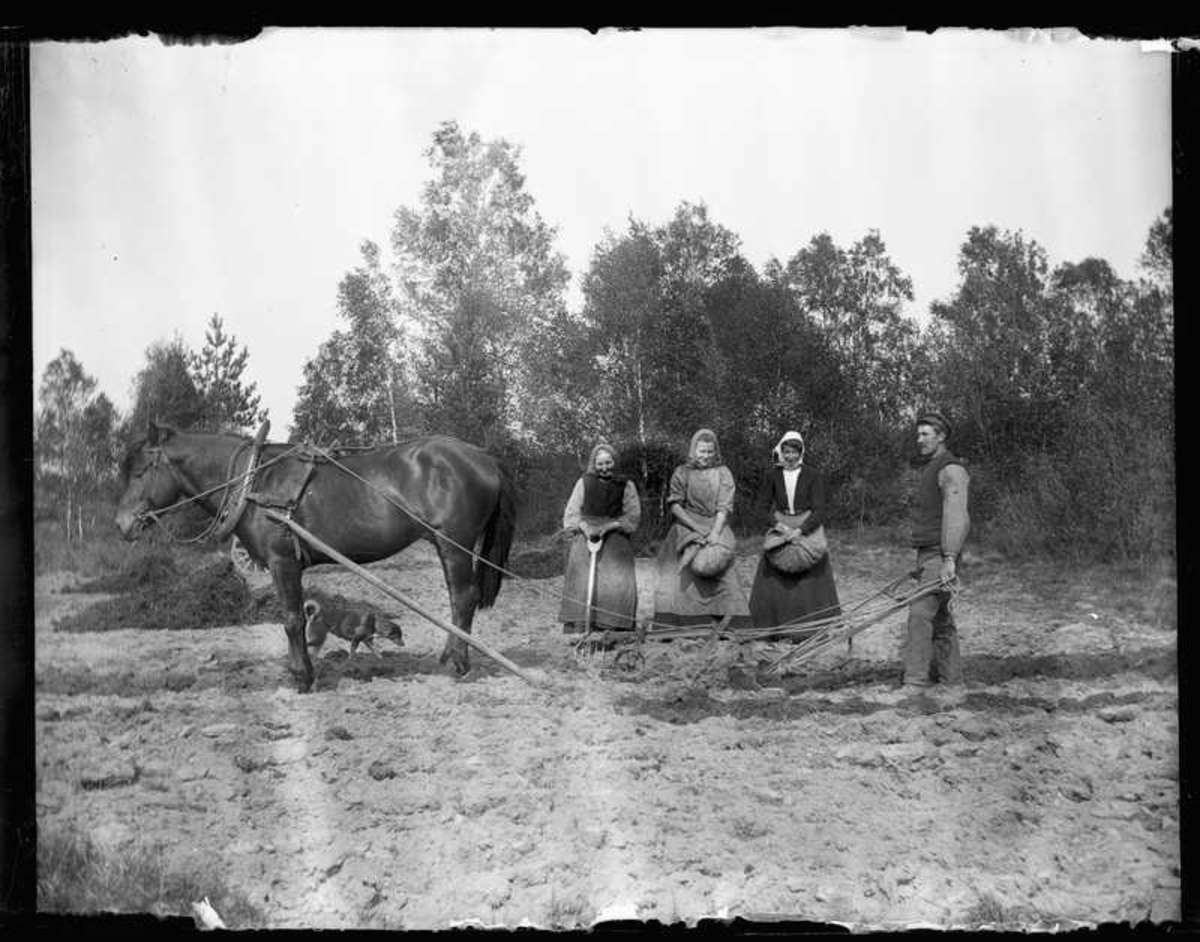 Potatisläggning på Arnstorp maj 1914, Britta Berntsdotter, Hjärtum 1843-07-12, håller i grepen, Beda Jonsson född Björn, Bäve 1892-12-20 och Olga Jonsson, född Olsson, Forshälla 1891-05-12 har potatis i sina förkläden och Abraham Jonsson, Hjärtum 1875-01-13 har satt hästen framför plogen