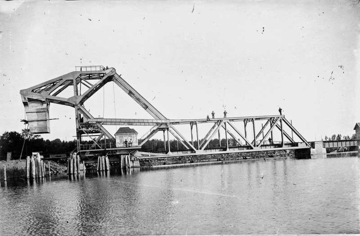 På andra sidan bron ser man att banvallen till järnvägen ligger kvar över kanalen, så fotot är inte senare än 1916. Bron togs i bruk augusti 1916.