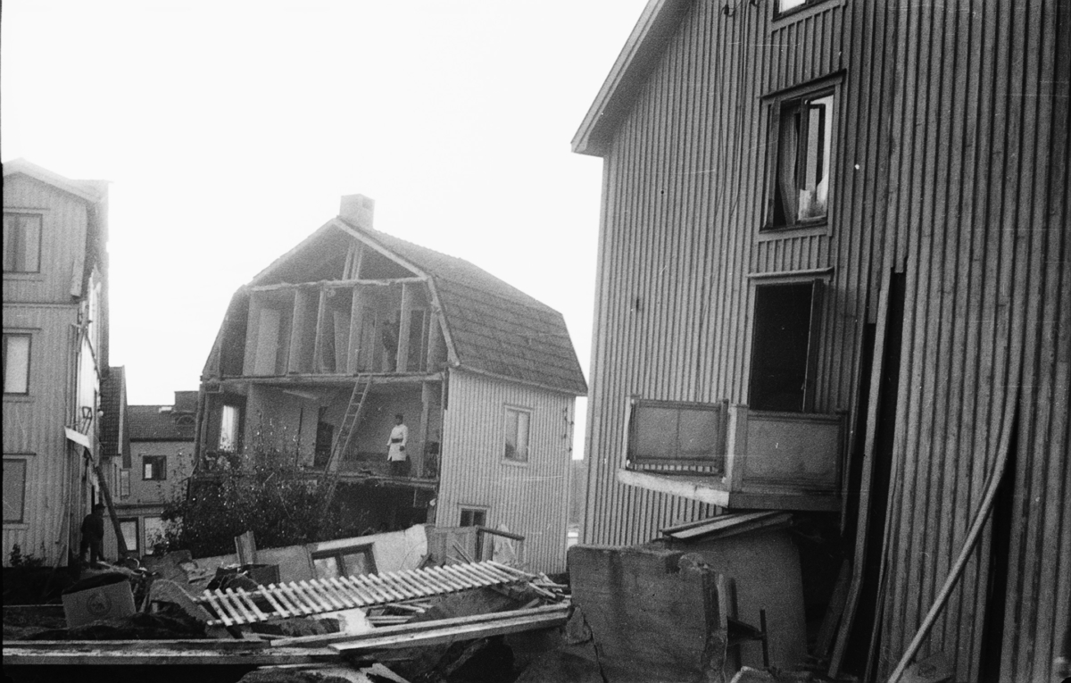 Titel: Nödinge. Surte. Surteraset 1950. Jordskredet ägde rum kl. 08.11 den 29 september 1950, och varade i ca 3 minuter. Över 30 hus drogs med i det 400 meter breda och 600 meter långa skredet av kvicklera ner mot Göta älv. Rasmassorna kom att blockera fartygstrafiken på älven i flera veckor. En människa omkom i raset och ca 450 blev hemlösa. Bara minuter innan raset hade ett persontåg med 800 passagerare passerat rasområdet. Både järnväg och stationshus sjönk ner i rasmassorna.
