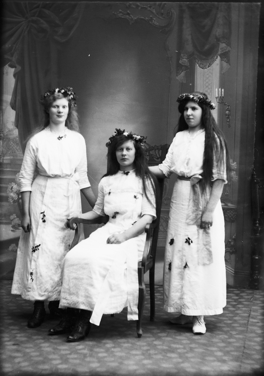 Ateljébild där tre flickaor är klädd till brudar/tärnor. Alla klädda i vita klänningar med påsydda, konstgjorda blommor. Atta är försedda med krans.