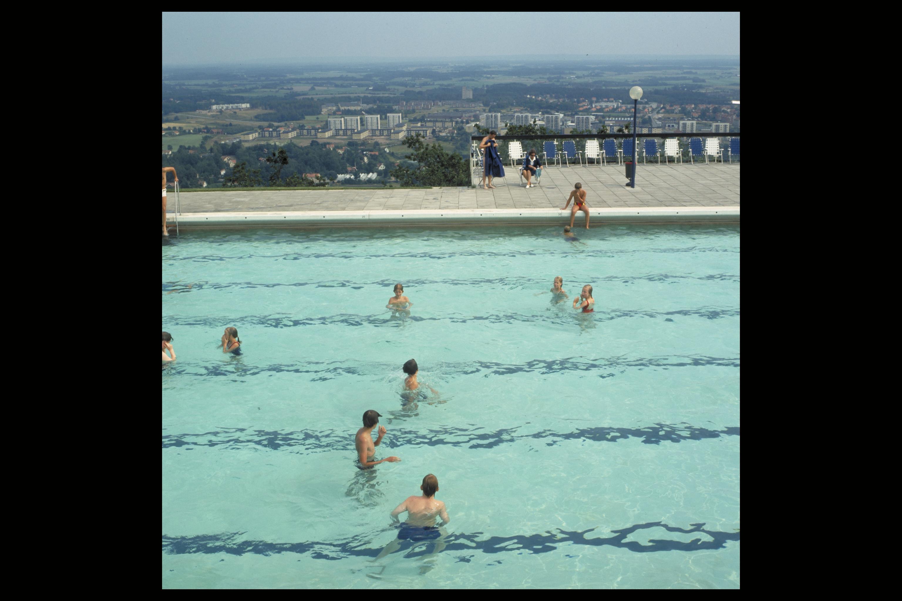 Bad uppe på Billingen, Skövde i bakgrunden. Bilden troligen från slutet av 1960-talet.