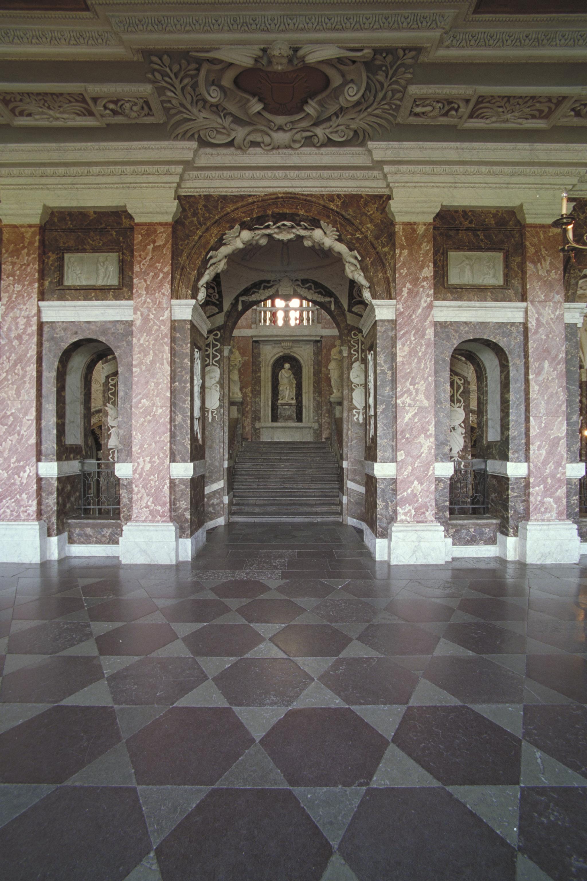 Slottets trapphus, änglastuckatur över portal på huvudvåningen.
